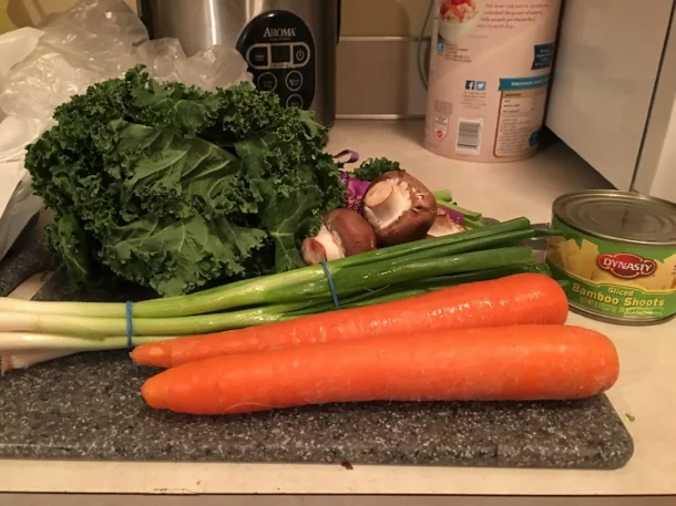 Time to gather our ingredients for our adventure into heavily pre trodden soup territory. Clever readers who have gone on ahead and are only reading the captions and responses, will at this point notice that I have procured mushrooms, green onions, carrots, eggs, kale and bamboo shoots. They may also notice that I have forgotten two very important ingredients: fresh garlic and seaweed.