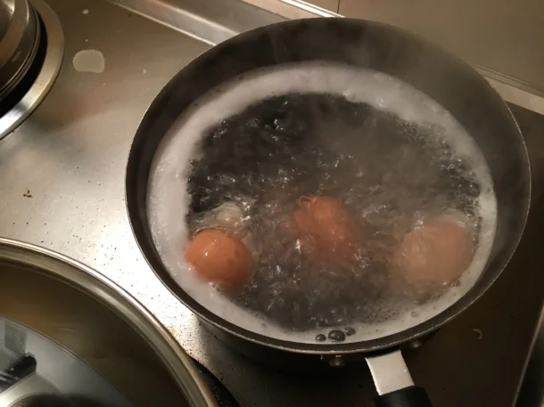 Those clever readers are back I can tell, and they’re wondering as to why i’ve boiled my eggs separately from the stock. Surely while heating the stock and boiling the vegetables I could simply poach the eggs. Thus saving myself the aggravation of splitting their “sacks” to remove the delicate oblong orbs housed within. Yes I was aware of the caption mans tasteless testical joke, and now we’re all clenching our proverbial legs at the imagery it has produced. Blame him not me.