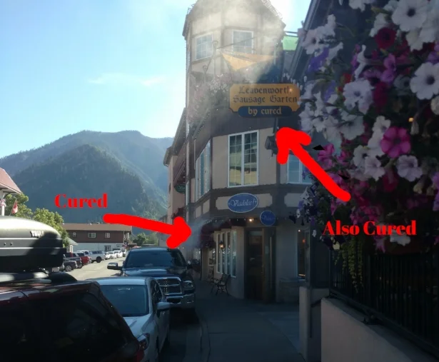 Let me start with something of a warning: JJ and I have a definite favorite of the two sausage gardens. After our second time eating there, we went and personally bought the sausage they use to cook at the cabins during last summer’s adventures. That favorite was our starting destination: a place we call “Cured”, but is technically called “Visconti’s Leavenworth Sausage Garden by Cured”. That mouthful of a name, while perfectly explaining why we go by the short form, does have a reason to be that long: Visconti’s is a local Italian restaurant took over the building it’s in, generating new businesses as it did so. The upstairs is the restaurant itself, while the lower floor became a gelato shop and butcher’s shop where they could hand-make the various salamis, sausages, prosciuttos, pepperonis, and other meats used in the restaurant. They named the butcher shop “Cured, by Visconti’s” So, Visconti’s had a butcher shop making sausages, and it acquired an open air lot next to the building, so it made a sausage garden. We just call both of the places Cured, and rely on context for which one you mean. (“I’m going to cured for lunch” versus “I gotta stop at Cured, grab some stuff for the party.”)