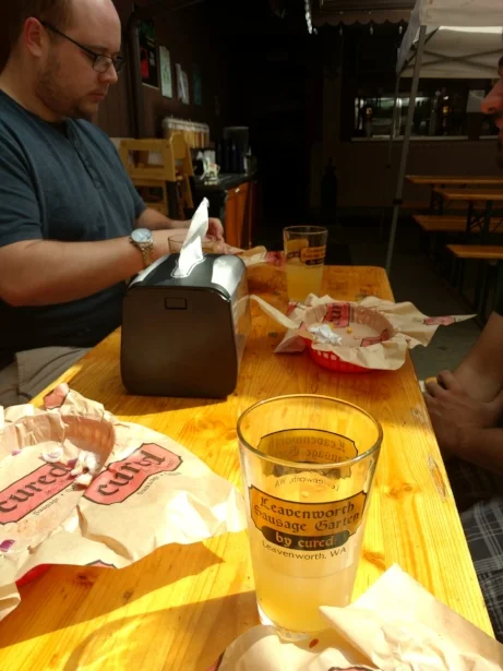 No, today’s post is about the finale of our bacchanal, the Monday morning breakfast. Jason had petitioned that we eat ‘decadently’ for our final meal together, and this presented JJ and me with a quandary: see, Leavenworth, by stint of its many fine hotels, doesn’t really have a big breakfast scene. There’s 2 breakfast focused restaurants in town, and we had already eaten at the better of the two the day before. We decided to improvise, and go with what makes Leavenworth’s food scene pop: a breakfast of beer and brats, and then more beer and brats, by attending the two main sausage gardens in town. How did it go? Did anyone die? Keep reading to find out! Because, you know, that’s the standard format of information transfer in written works. Why were you trying to interrupt me with questions?