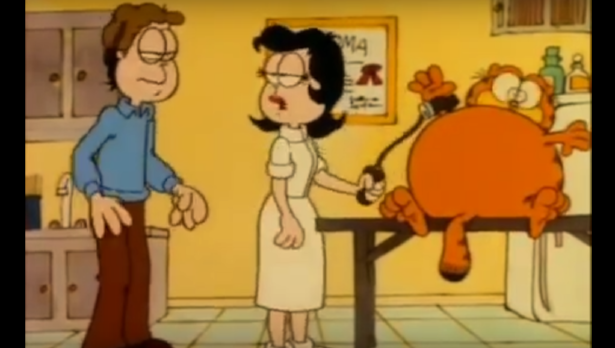 In any case, Garfield is immediately distracted by a calendar, stating that today he has an appointment at the vets, which distracts me, because that should be “Vet’s”, possessive, not “vets”, plural. Unless he’s taking Garfield to a VFW Chapter Meeting. Garfield has a bit that plays on the idea of food that’s “bad” for you being “good” to eat, and therefore the “good” food the vet will recommend will be “bad”, and that’s not good. It almost works, but I think it’s hurt by the fact that Lorenzo Music (Garfield’s voice actor and ‘Best Goddamn Name in the World’ winner) has a slow, measured cadence that makes a quick patter sequence like this a little weak.