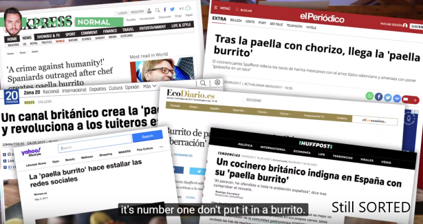 (Quick summary: he made a Paella burrito, which might have been fine on its own…if he had made the paella he PUT in the burrito “correctly”. There’s too much to unpack quickly, but imagine if someone told you they’d made you a “quesadilla Pizza”…and then explained that they quesadilla they used as the base was filled with Bleu Cheese, sliced apple, and oysters. That may or may not be terrible, (the New York Times has a recipe for “Oyster and Bleu Cheese Pie” that includes sliced apples, so it’s not an impossible flavor combo) but it sure as shit isn’t what’s expected in a Quesadilla, so we need to take this train back a couple stations. (Also, literally the year before, Jamie Oliver, a DIFFERENT English chef named Jamie, also “screw up” a paella in a similar way, so Spanish twitter was already a little testy about it.) )