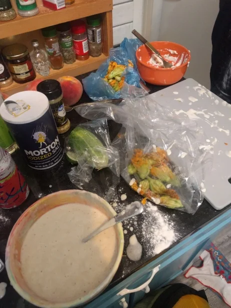 If you’re cooking blossoms, the ‘default’ method is to fry them. which is what I did. But first, I made a HELL of a mess. See, this recipe was so simple and fast, that it actually fell into what I call my “negligible gap”: when a task is so easy I could do it any time…so I never do it. 6 ingredients, 20 minutes of cooking time, and I had intentionally picked the HARD version: you can cook these by just dipping the blossoms in batter and frying that. Knock out half the ingredients.