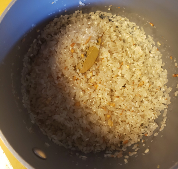 Anyway, minced garlic salt and bay leaf go in some hot oil, lightly brown the garlic, then add the rice, toss to coat with the flavored oil, add the water, cover and cook the rice. Bing bang boom. On a good day, 25-30 minutes with prep.