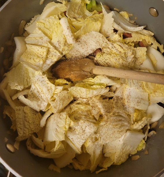 Those all get dumped in with the sausage, and cooked off until the onion is translucent. The next step is where we up the Eastern European factor, by adding a pound of cut cabbage: molly’s version calls for green, but my family had 2 pounds of fresh napa cabbage we needed to use up (bought the week before for a President’s Day Hot Pot) so we went with that. The instruction is to add it with “2 tsps of salt, and lots and lots of freshly ground black pepper.” An instruction we followed with around 40 cranks on our pepper mill.