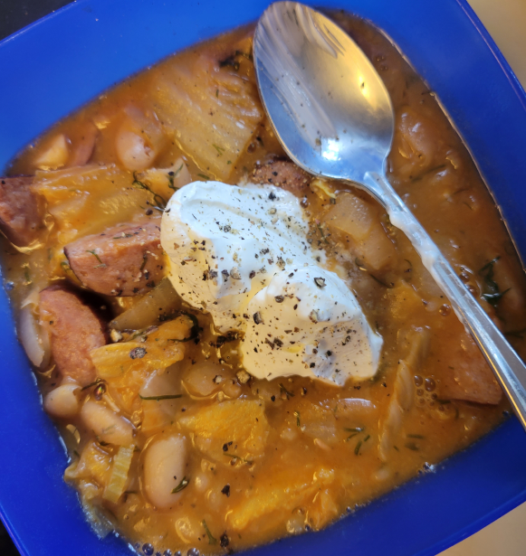 The last thing you’ll need is sour cream, because of course it’s in this recipe. We already had dill, kielbasa, and cabbage, why would we leave rubles on the table? The sour cream is for dolloping in each bowl once you think the soup is cooked down and tasty enough: you ladle it into a bowl, dollop some cream, crack some more pepper, and drizzle a little olive oil on it, and boom, you’ve got a powerhouse of a soup.
