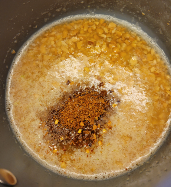 In case that image was insufficiently clear, if you read last week’s post, this is going to look familiar. You wanna chop up peanuts, get them in some oil, and cook them over medium heat, 4-5 minutes, until the peanuts are lightly browned. Then, you’ll grate 2 cloves of garlic into the hot oil, so they par-cook, rather than the full cooking of last week’s method. Then you add ancho chile powder, honey, red pepper flakes, and salt.