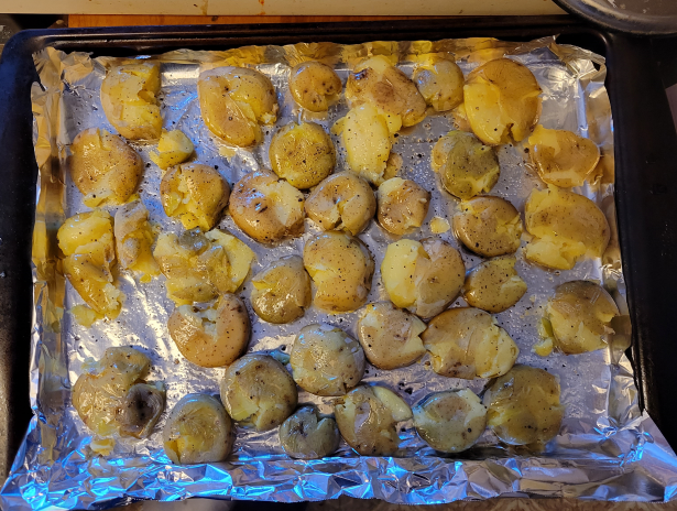 Toss potatoes onto a rimmed baking sheet, and smash to ½” thickness with a firm flat surface (coffee mug, cast iron, etc). Coat with olive oil, turning as needed. Taste and season with salt and pepper. Place baking sheet in the oven.