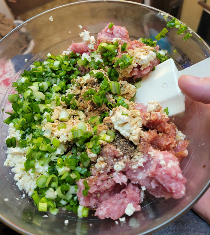 Eventually, after comparing to all the varieties I knew, and researching different types,  I came to the conclusion/assumption that the dish is closest to something called “Xian Bing”, named after one of the oldest cities in China, and former capital. As far as I could tell, while it’s more common to make them with beef now, there isn’t a hard-and-fast recipe everyone follows, and I would be safe if I riffed on the ingredients a little. Which was good, because in the show, it’s definitely pork, and visually, they don’t season this dish AT ALL on the show: it’s just the minced pork, minced tofu, chopped scallion, MAYBE some shredded ginger or garlic…