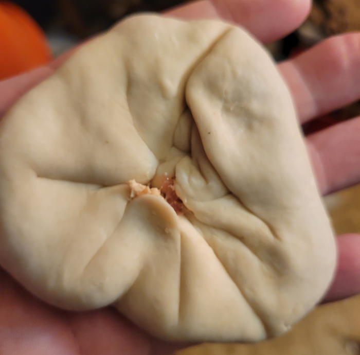 The next step is a CLASSIC “easier said than done” kind of simple recipe issue. You made the dough, you made the filling, now just portion out the dough, and make the dumplings. So just make 20 portions of dough, 20 poritions of meat, roll each thing of dough out, and form it into something that kind of looks like a respectable soup dumpling kind of vibe…and then immediately squish it into a kind of heinous looking flattened pancake.