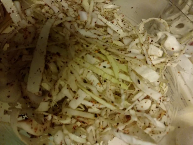 This recipe uses it to flavor the cabbage, by tossing finely shredded strands in a mixture of shicimi, salt, and sugar, and letting them brine shortly. I used up about a quarter of a head of cabbage making the pancakes for my whole family.
