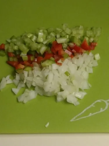 See, the original recipe calls for celery and onion mixed into the meat mixture. We didn’t have as much celery as the recipe called for, so we added red bell pepper.