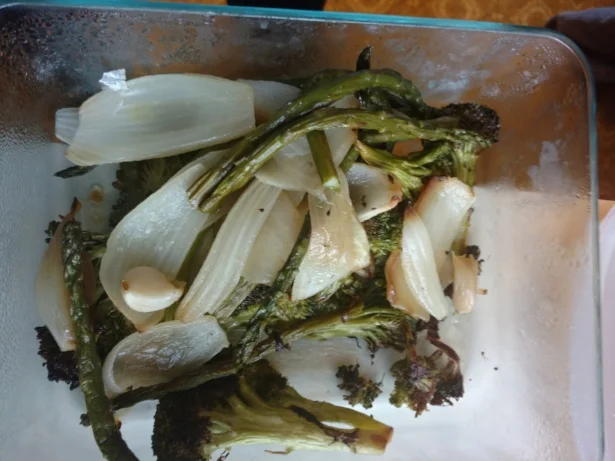 - Heat the oven to 400 degrees. Toss the broccoli, asparagus, onion and garlic in the olive oil, and place on two rimmed baking sheets. Roast for 25 minutes, swapping racks and rotating halfway through. You can blend while hot, or let cool and blend later.