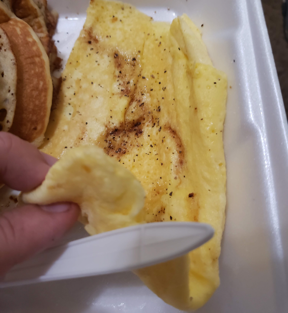 But yes, eggs set up when exposed to heat, and the higher the heat, the more they’re going to react. As proteins, eggs are susceptible to the Maillard reaction, meaning that if you cook eggs to a solid state, you can then sear them. I don’t know of anyone who’s done this, so I assume there’s some unforeseen complication to the process. (If I had to guess, it’s probably because overcooking eggs creates sulfur compounds, so by the time you’re getting a good seared crust, you’re also making it taste like a matchhead. But only investigation could prove that.) More relevantly, A crucial detail is that eggs will set up in cohesion with contiguous egg proteins. Which is a fancy way of saying “left alone, the eggs will set into one huge sheet of egg”. This is how you end up with diner-style eggs, like the kind I got for breakfast today.