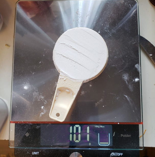 The important thing here to talk about why you should stop using measuring cups in your baking. This is a pretty basic maxim of professional chefs/cooks, so if this is the first time you’re hearing about it, let me DEMONSTRATE why people say to do so. Cooking is, at its fundamentals, a matter of ratios, so being consistent in your ratios is important. So if you just scoop one half cup of flour in the 1/2 cup itself and level it off with knife, you get